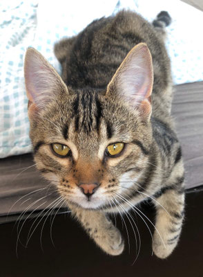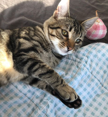 Die Familie berichtet: "Yumi war vom ersten Moment an sehr zutraulich und neugierig. Sie wollte sofort jede Ecke im Haus erkunden und konnte es nicht erwarten, bis sie auch in den Garten gehen durfte. Sie liebt es, wenn viel Betrieb ist und sucht zwischendurch immer wieder unsere Nähe. Sie zeigt uns auch, wenn sie spielen möchte und legt uns dann ihre Spielmaus vor die Füsse und miaut. Mimi ist war noch etwas skeptisch, aber sie lässt die kleine Yumi bereits etwas näher an sich heran. Wir haben Yumi sofort in unser Herz geschlossen!"