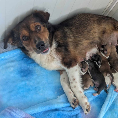 Lucy haben wir Anfang Juni 2025 bei einer Kastrationsaktion bei einem abgelegenen Bahnhof hochträchtig angetroffen. Sie hat ein paar Tage später neun wundervolle Welpen bei uns in der Auffangstation geboren. Zwei sind leider an Caine Corona verstorben. Ihre Babys sind Yoshi, Tapani, Buddy, Somara, Blümchen, Hidi und Hailey.