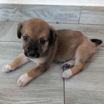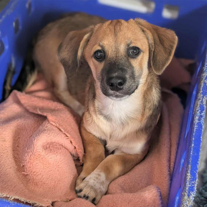 Ihre Mami Stella ist eine Strassenhündin, die wir im Juni 2025 hochträchtig bei uns aufgenommen haben. Ein paar Tage später ist Thuja mit ihren sechs Geschwistern Alwin, Elly, Olga, Sarina, Sämi und Umbra bei uns in der Auffangstation zur Welt gekommen.